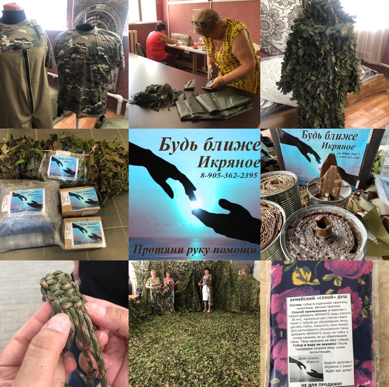 «Если вы хотите внести свой вклад в нашу общую Победу, мы будем рады любой помощи! Добровольное пожертвование (на закупку тканей и комплектующих для душа, свечей и браслетов) можно сделать по тел. 8-905-362-23-95, Сбербанк, Светлана Владимировна Р., с пометкой «Своих Не Бросаем». Также вы можете принести ткани на пеленки, гуманитарную помощь, рыбацкие сети и др. по адресу: Икряное, ул. Мира, 7, дом быты «Дельта».