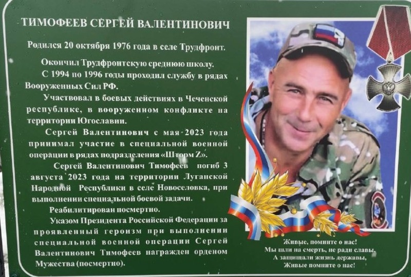 Сергей Тимофеев – 1976 года рождения – с мая 2023 года участвовал в СВО в рядах подразделения «Шторм Z». Погиб 3 августа на территории Луганской Народной Республики при выполнении специальной боевой задачи. Указом Президента РФ за проявленный героизм при выполнении воинского долга награжден орденом Мужества (посмертно).