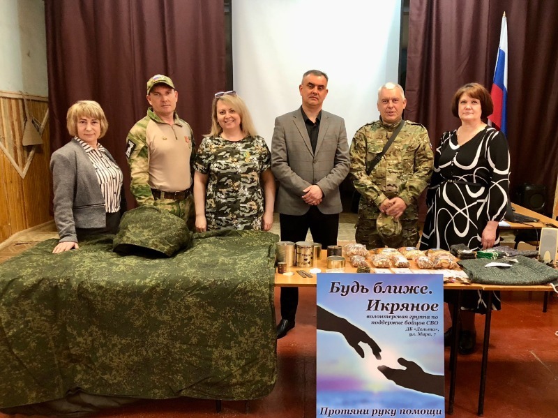 Представители волонтёрской группы «Будь ближе. Икряное» подготовили две выставки: изделия, созданные волонтёрами, и трофеи, привезённые из зоны боевых действий. На встречу был приглашён боец СВО Александр Овинкин.